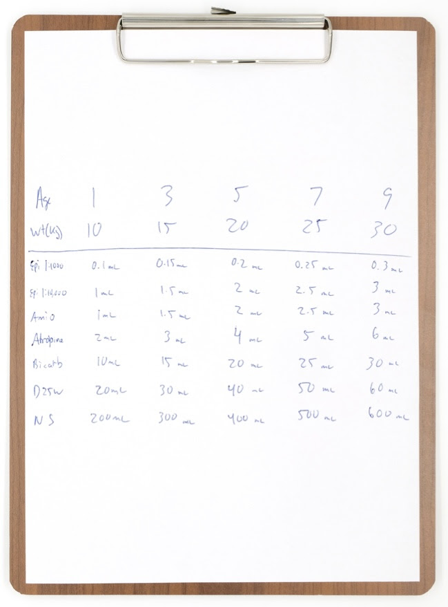 On that Sunday morning, on that blank sheet of paper, I began to channel Bob’s teachings and wrote down 5 ages, 1-3-5-7-9. I then searched the literature for the few papers that listed formulas for predicting ideal body weight based on age and began to run the math. It nicely worked out to 10-15-20-25-30 Kg. From there, I listed the few medications that I’d potentially use in a code; Epinephrine (1 mg/mL and 1 mg/10mL), Atropine (yes I’m old), Bicarb (repeat the old comment), D25 and Normal Saline. I then did the calculations and wrote down the volumes for each drug, and that was my ah-ha moment!